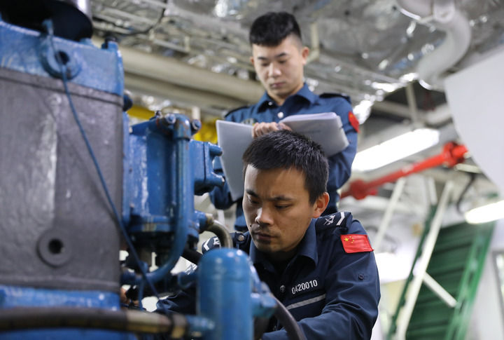 不论白天黑夜,机舱里时刻都能看到两名舰员结对巡检的身影。一旦发现故障险情,几位技术过硬的“老师傅”就要带着工具在狭窄的舱室里连续奋战抢修,保证设备安全、健康运转,往往一干就是几个小时,大家浑身湿透,满脸油污。