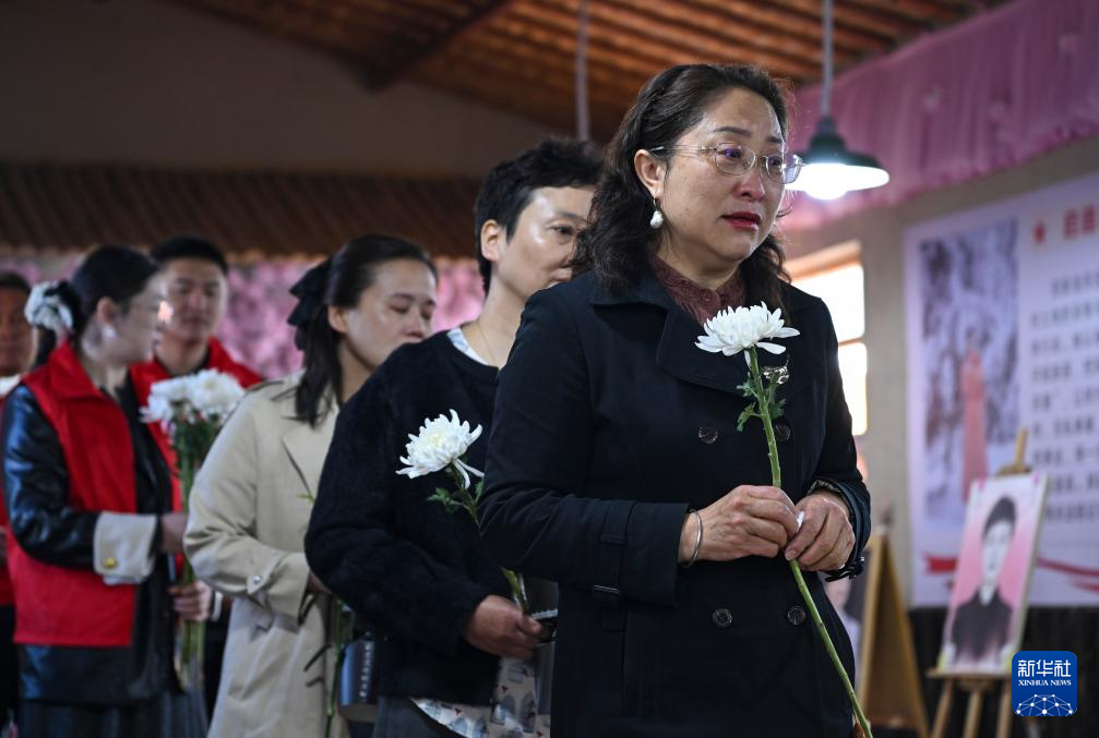 4月3日,人们在新疆昭苏县灯塔知青馆娇龙厅献花。