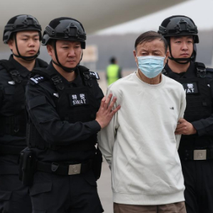 4月3日在沈阳桃仙国际机场拍摄的被押解回国的犯罪嫌疑人王某某(中)。新华社记者 潘昱龙 摄