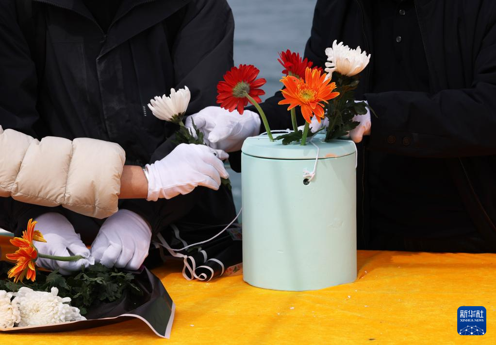 海葬仪式上,陈琦团队的工作人员帮助逝者家属给可降解骨灰罐插花(3月29日摄)。