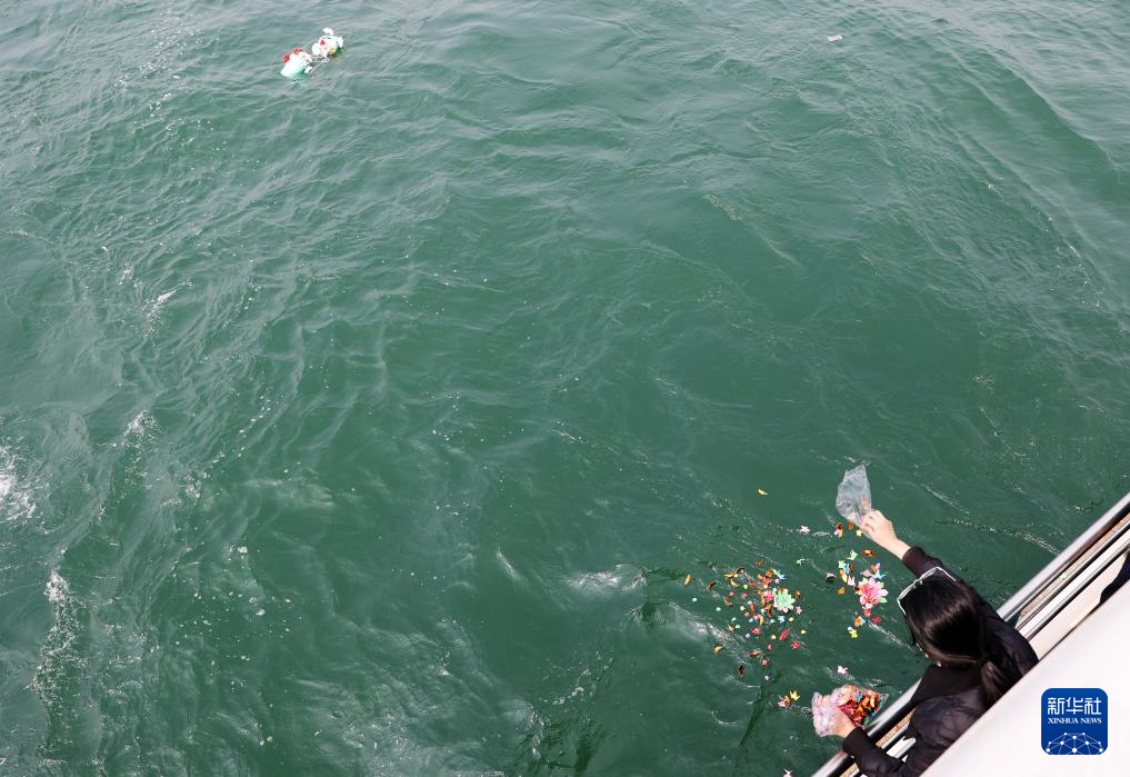 海葬仪式上,逝者家属向海中抛撒折纸鹤、折纸花等,寄托哀思(3月29日摄)。