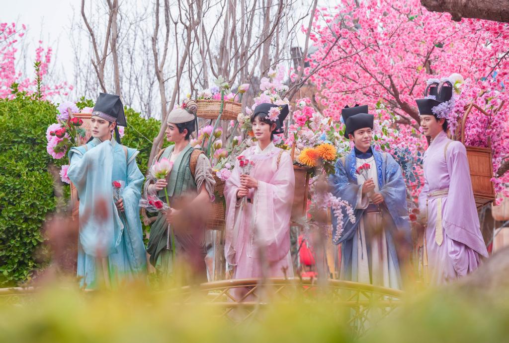 在开封清明上河园景区“簪花踏青”节目里,演员正与游客互动。(王正一 摄)