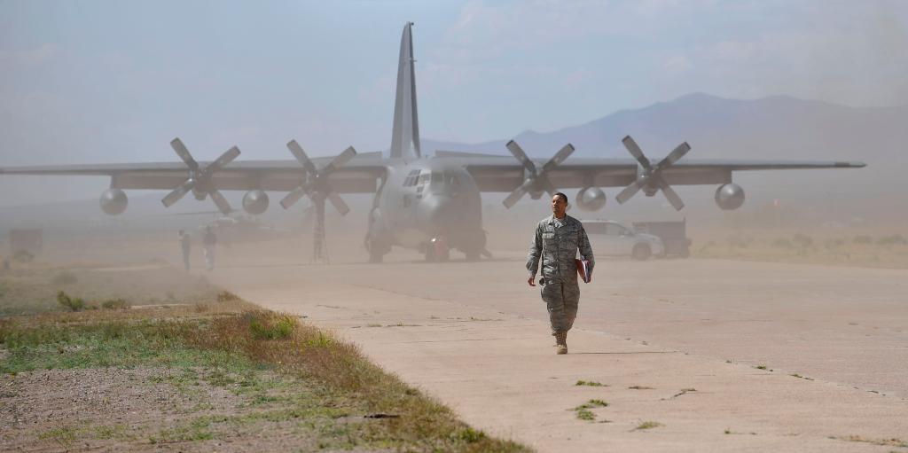 2010年4月21日,在美国亚利桑那州图森以南一处机场举行的2010“雷天使”军事搜救演习中,一名搜救人员走在C-130运输机前。新华社记者张军摄