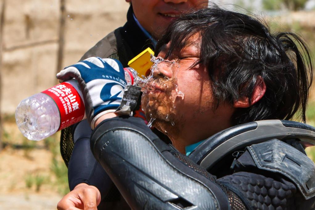 2023年5月29日,张雪在2023年中国环塔(国际)拉力赛暨中国汽车越野拉力锦标赛新疆分站赛于田县克里雅河赛段比赛越过终点后补水休息。新华社记者 郝昭 摄