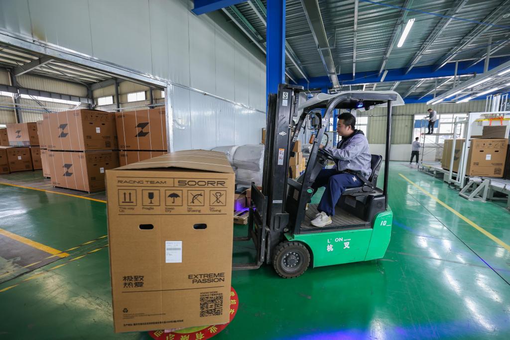 2026年4月1日,在重庆两江新区“张雪机车”生产车间,工作人员将包装好的整车搬运至库房等待发货。