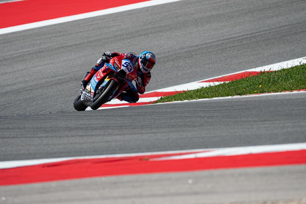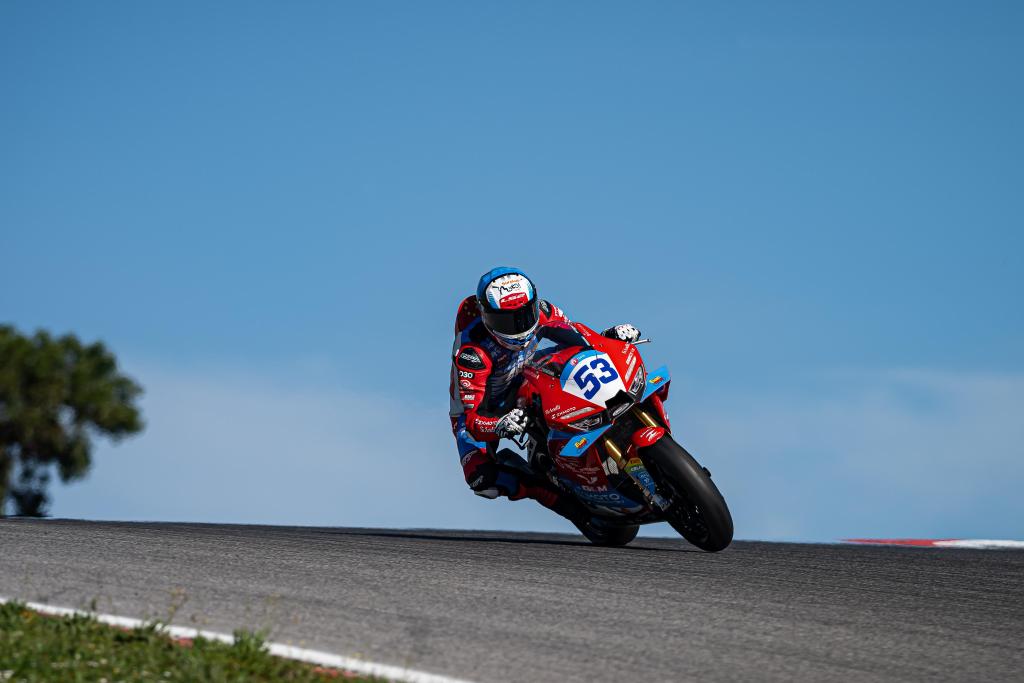 2026年3月28日,车手瓦伦丁·德比斯驾驶“张雪机车”(前)在葡萄牙举行的世界超级摩托车锦标赛双回合正赛中比赛。