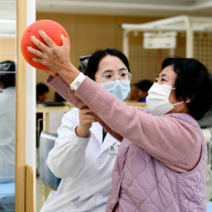3月25日,在山东日照市康复医院,医护人员协助老人做康复训练。新华社记者 郭绪雷 摄