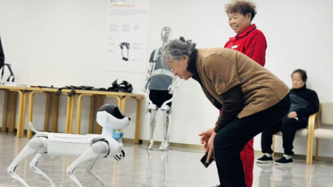 浙江乌镇智能养老中心内,院内老人正与机器狗互动。新华网发(钟月英 摄)