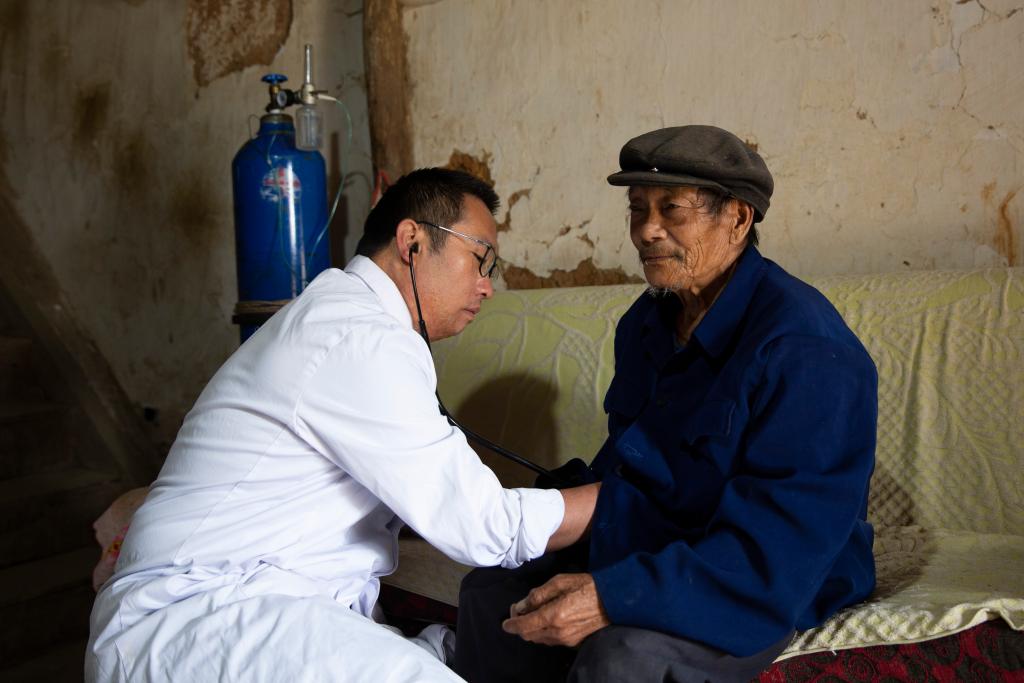 云南省曲靖市沾益区人民医院呼吸科医生李培猛入户为患者听诊(2025年10月22日摄)。新华社发(杨俊鹏摄)