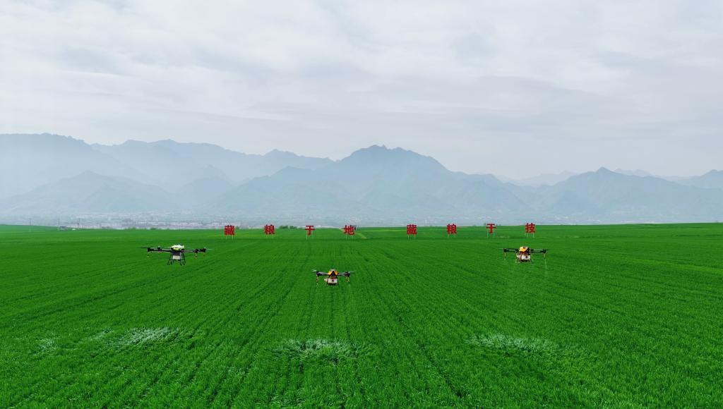 图为陕西省西安市长安区神禾塬的万亩优质粮食生产基地,植保无人机正在作业。新华社记者刘彤 摄
