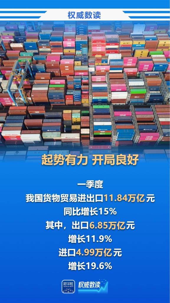 国务院新闻办14日举行新闻发布会,介绍2026年一季度进出口情况。今年一季度,我国货物贸易进出口同比增长15%,达到11.84万亿元,创历史同期新高。今年以来,外部形势更加复杂多变,各地区各部门认真落实更加积极有为的宏观政策,外贸起势有力、开局良好。