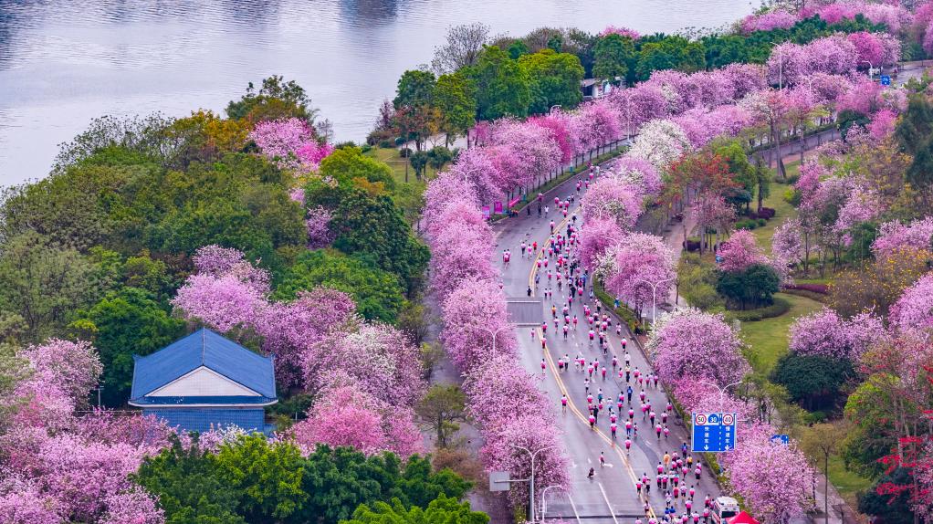 来自全国各地的跑者在广西柳州开满洋紫荆花的沿江赛道上奔跑。新华社发(黎寒池 摄)