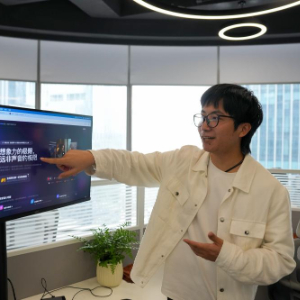 在位于广东省广州市海珠区的琶洲模方,广州烁谷科技有限公司创始人谢伟铎介绍该公司的语言模型(3月26日摄)。新华社记者 吴鲁 摄