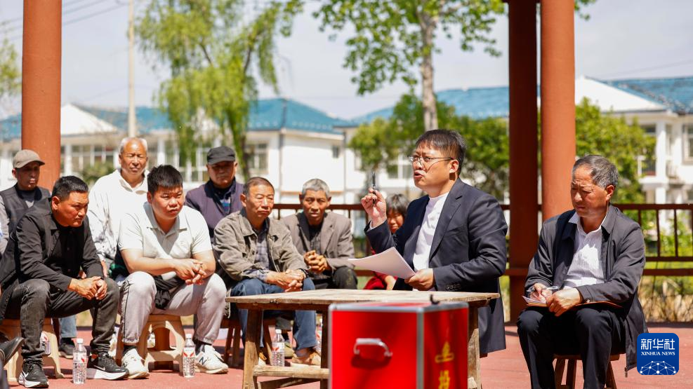 4月19日,泗洪县上塘镇垫湖村党委书记周磊(右二)向村民代表介绍今年拟办的民生实事。