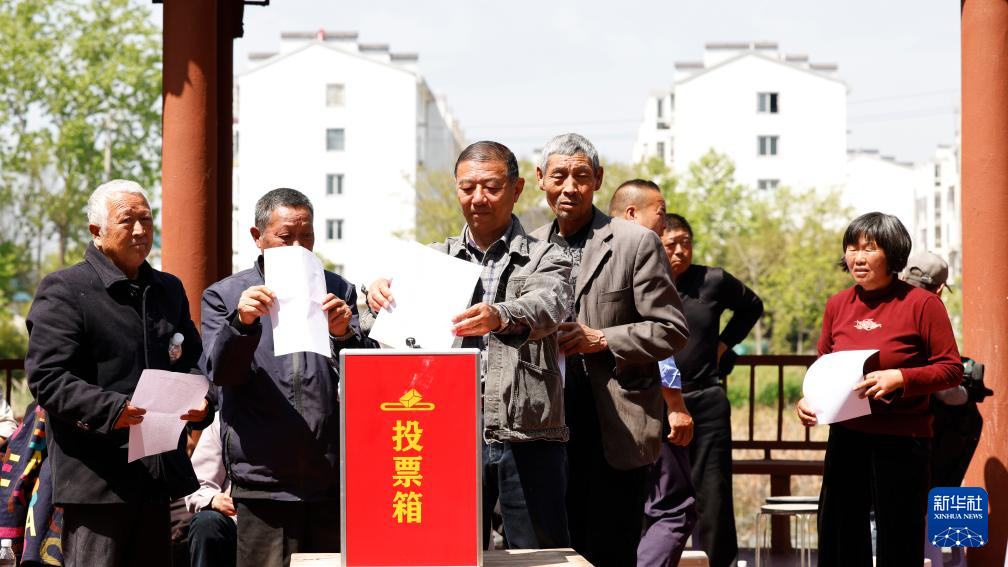 4月19日,泗洪县上塘镇垫湖村村民代表往票箱里投放民生实事表决表。