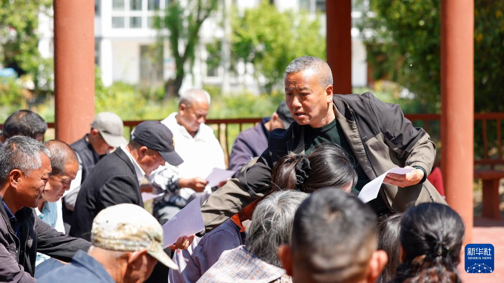 4月19日,泗洪县上塘镇垫湖村工作人员发放民生实事表决表。