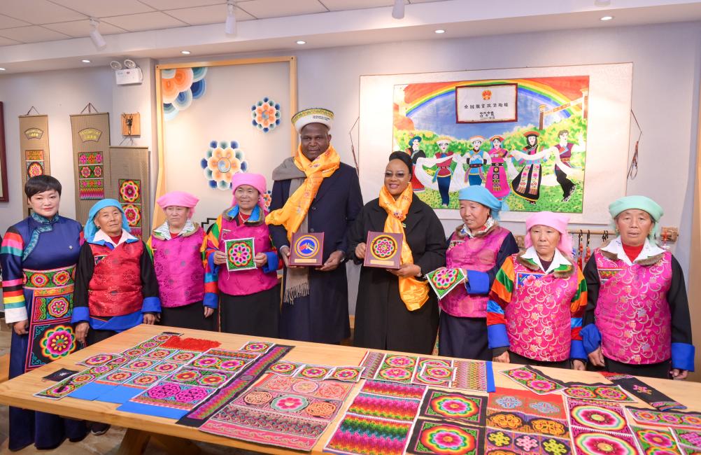 随后,查波一行来到土族盘绣园。园内,绣娘们正低头飞针。五彩丝线在指尖穿梭,一幅幅太阳花纹样的图案逐渐成形。