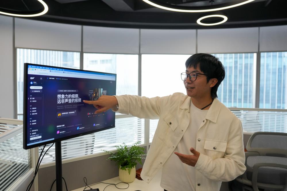 在位于广东省广州市海珠区的琶洲模方,广州烁谷科技有限公司创始人谢伟铎介绍该公司的语言模型(3月26日摄)。新华社记者 吴鲁 摄