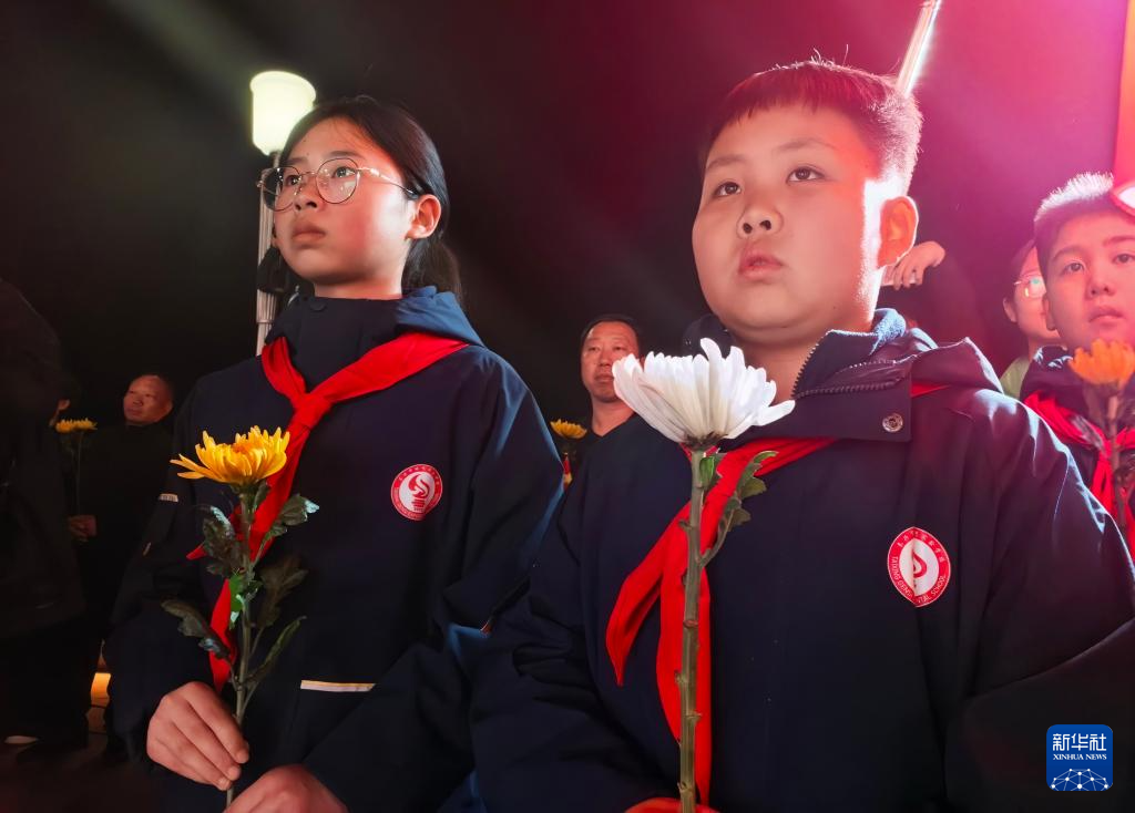 4月20日晚,师生代表在丹东鸭绿江边和平广场参加烛光追思活动。新华社记者 于力 摄