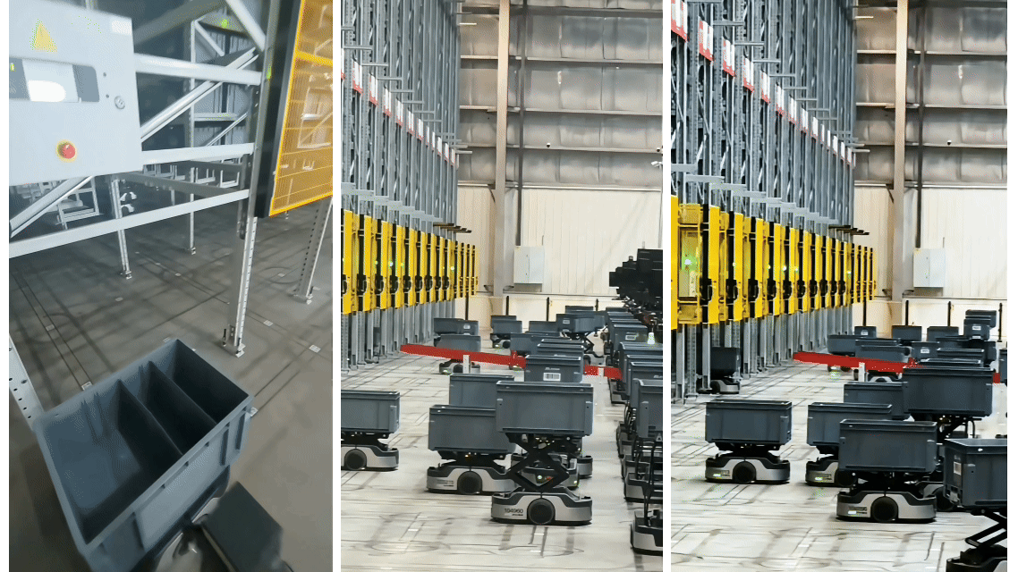 安徽合肥长丰县的一处物流基地,“智狼”机器人小车在货架间穿梭。