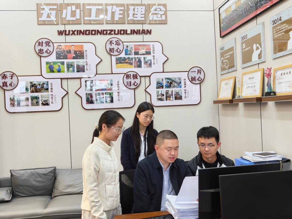 2026年4月13日,张海(右二)指导“张海工作室”跟班学习人员学习残疾人相关政策。(许秀棠 摄)