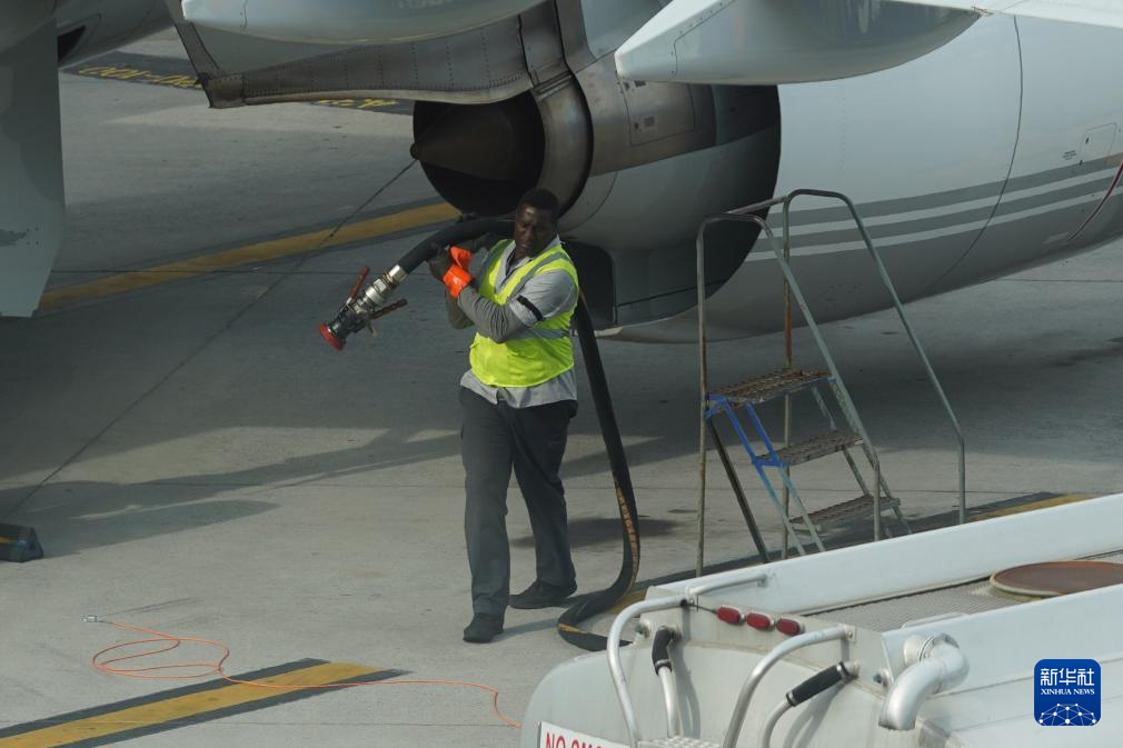 4月23日,在美国纽约拉瓜迪亚机场,工作人员为一架飞机加油。新华社记者 张凤国 摄