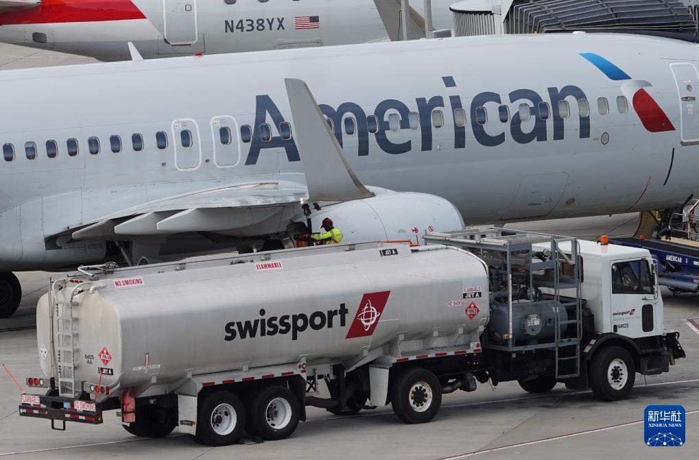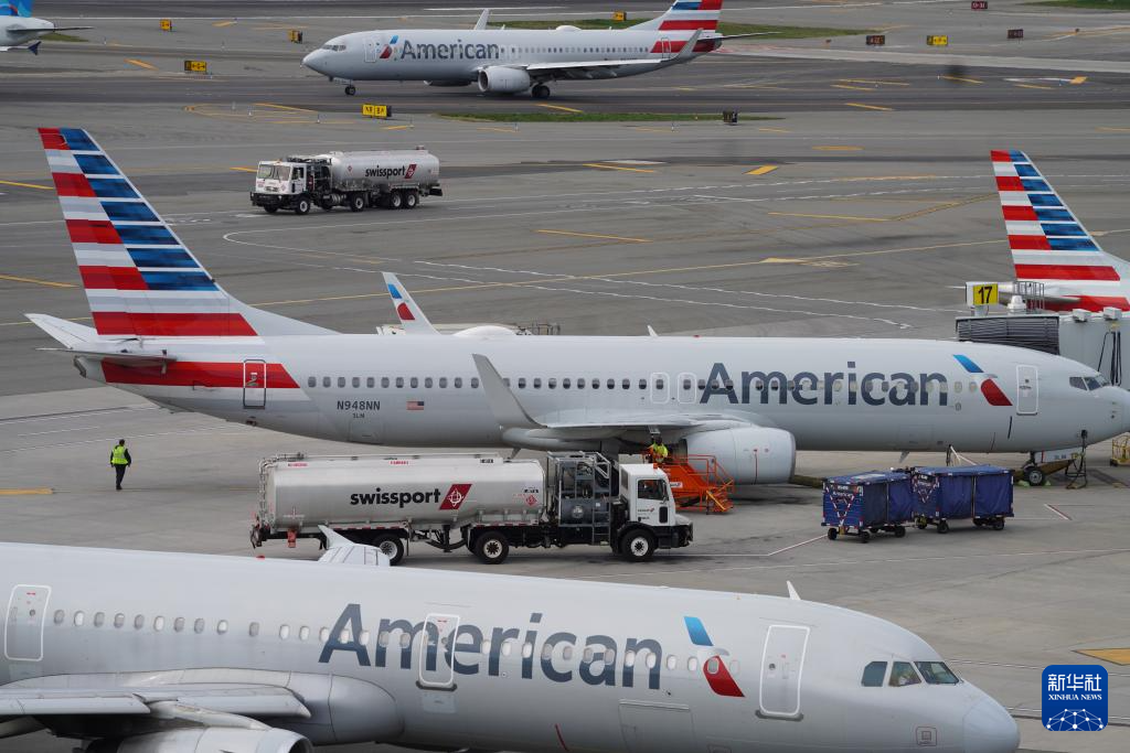 4月23日,在美国纽约拉瓜迪亚机场,工作人员为一架美国航空公司飞机加油。新华社记者 张凤国 摄