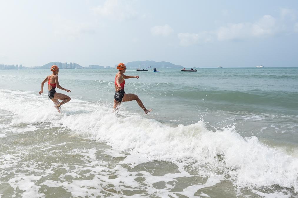 4月23日,选手在第六届亚洲沙滩运动会游跑两项女子个人赛中出发。新华社记者 朱峥 摄