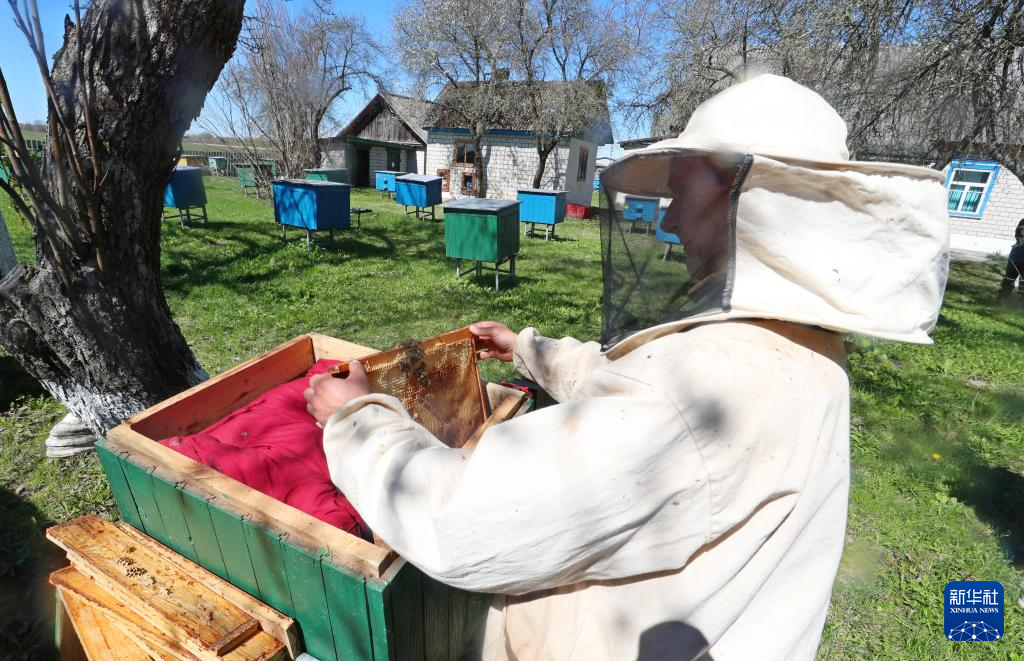 4月22日,在白俄罗斯波列西耶国家辐射生态保护区,蜂农查看蜂箱。新华社发(任科夫摄)