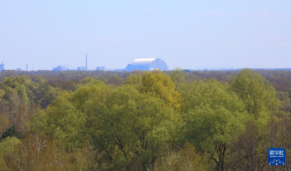 这是4月22日在白俄罗斯波列西耶国家辐射生态保护区防火瞭望塔上拍摄的远处乌克兰境内切尔诺贝利核电站4号机组的拱形掩体。新华社发(任科夫摄)