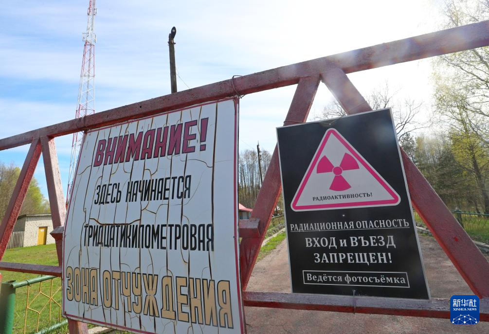 4月22日,在白俄罗斯波列西耶国家辐射生态保护区门口,警告标语上写着“放射性污染!禁止进入!”。新华社发(任科夫摄)