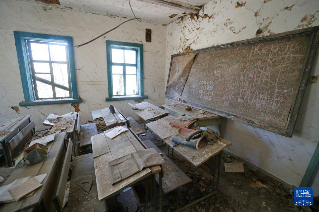 这是4月22日在白俄罗斯波列西耶国家辐射生态保护区内的德罗尼基村拍摄的一所废弃学校的教室。新华社发(任科夫摄)