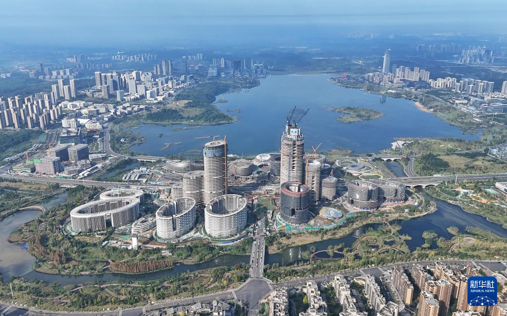 这是位于四川天府新区兴隆湖畔正在修建的成都科创生态岛(2024年10月23日摄,无人机照片)。新华社记者 刘坤 摄