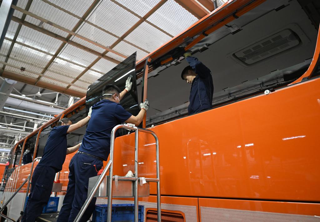工作人员在宇通新能源厂区海外承装车间生产线上作业(2026年3月30日摄)。新华社记者 李嘉南 摄