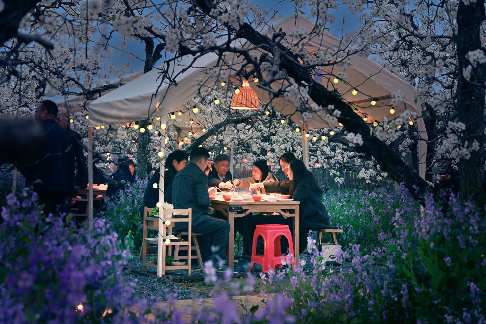 2026年3月30日,游客在安徽省宿州市砀山县梨小萌欢乐梨园品尝梨园火锅。新华社发(崔猛 摄)
