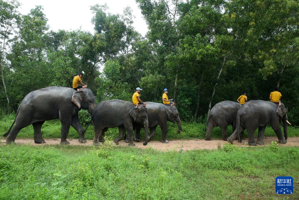 8月12日,大象行走在缅甸勃固省的温加波大象营地内。