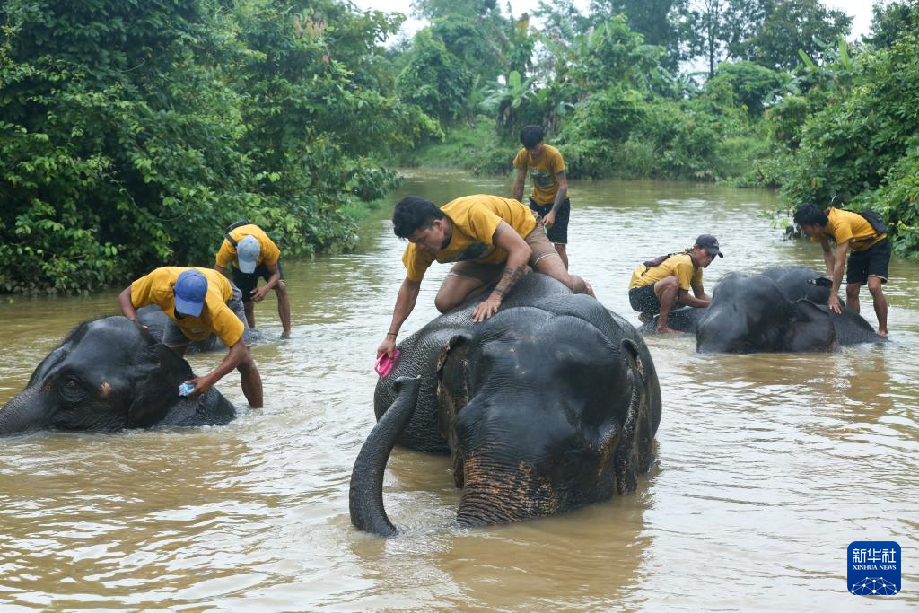 8月12日,在缅甸勃固省的温加波大象营地内,工作人员帮助大象洗澡。