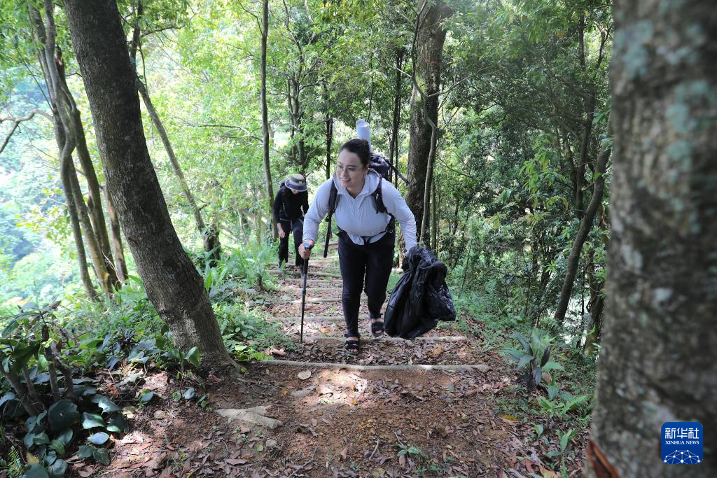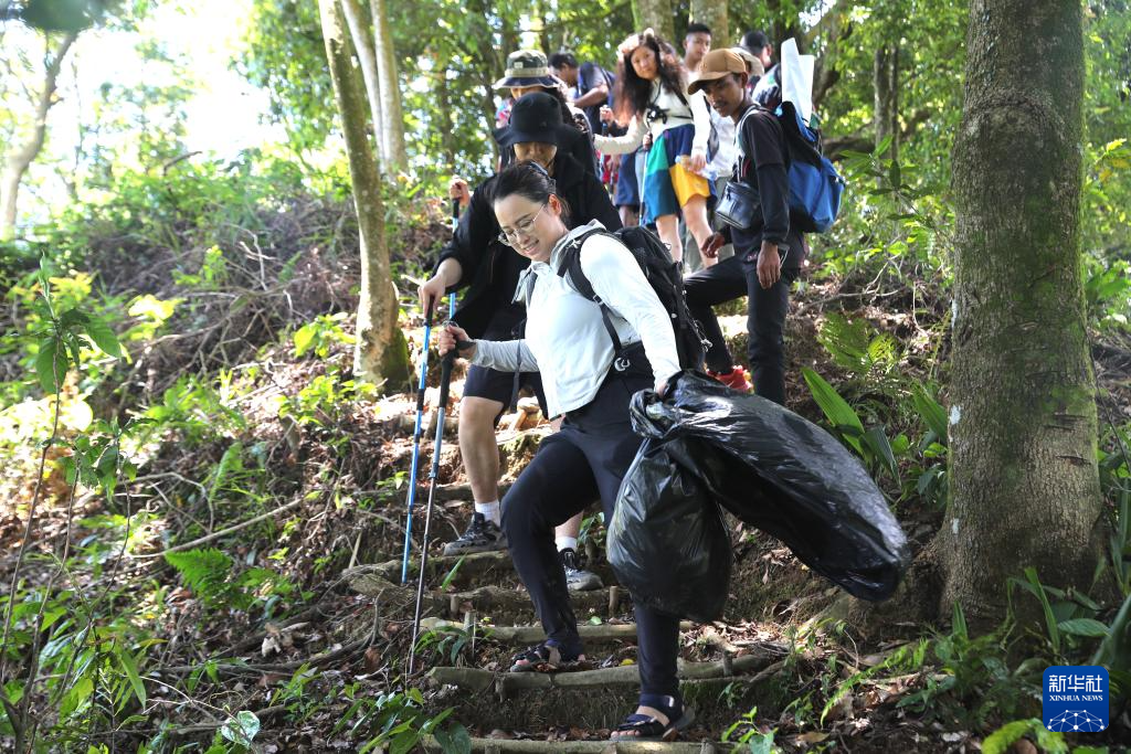 4月12日,在印度尼西亚茂物,石凯欣(前)和志愿者在徒步途中收集垃圾。