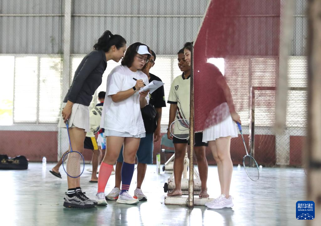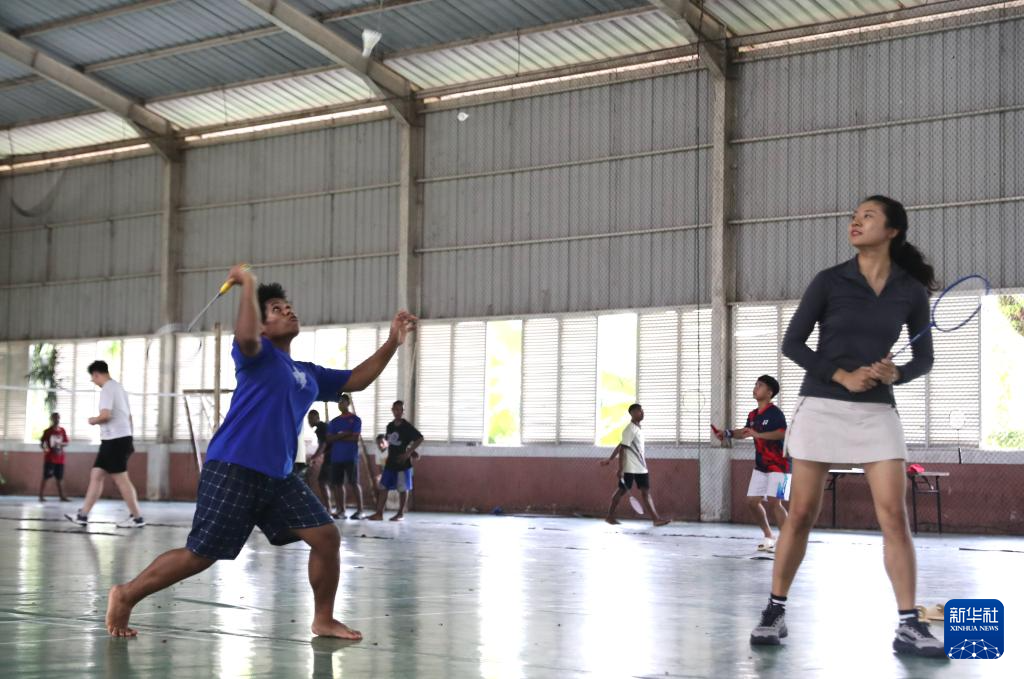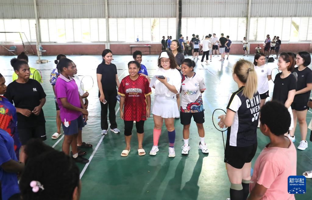 4月25日,在印度尼西亚万丹省唐格朗,石凯欣(中)组织志愿者和来自巴布亚部落的孩子们打羽毛球。