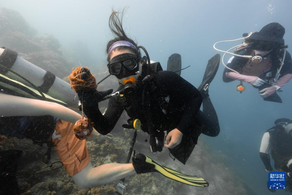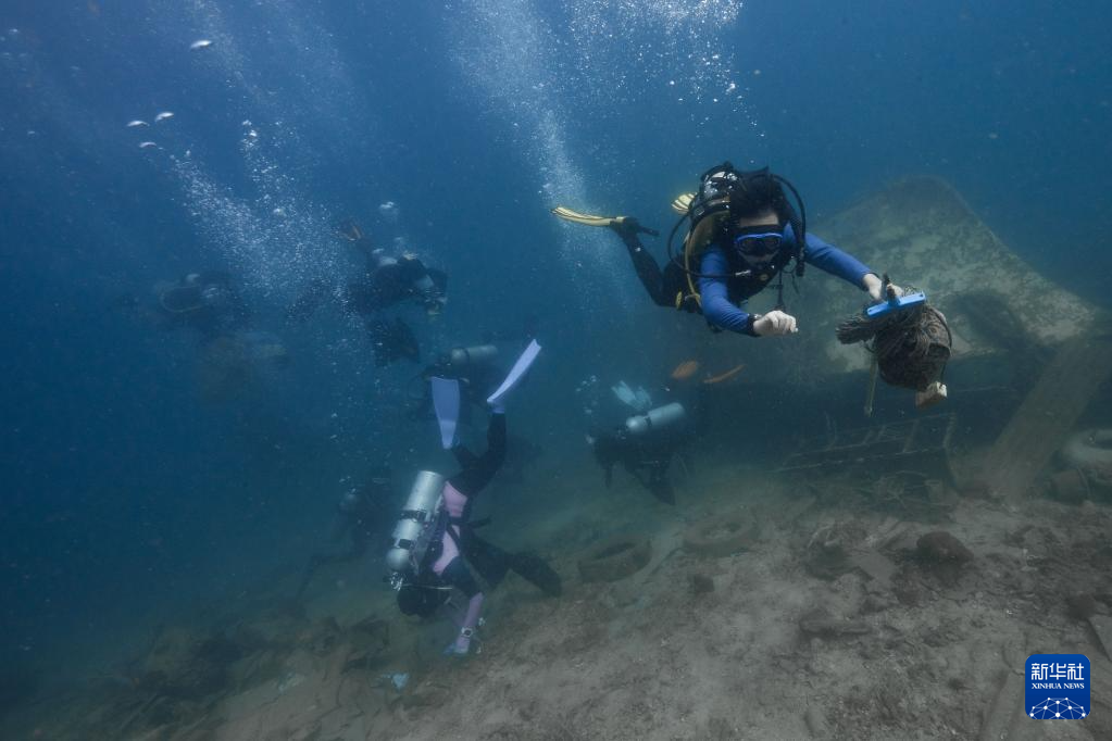 3月14日,在印度尼西亚雅加达的塞里布群岛海域,石凯欣(中)与志愿者潜水清理海底垃圾。