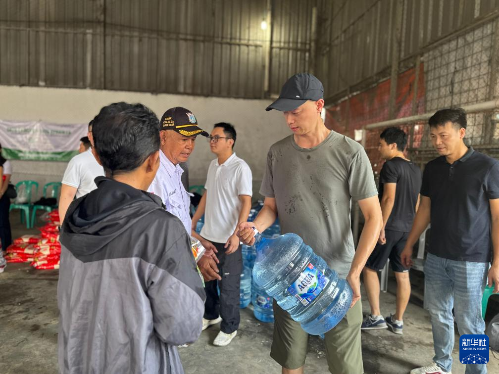 2月13日,在印度尼西亚雅加达,志愿者为遭受洪灾的社区运送桶装水(手机照片)。