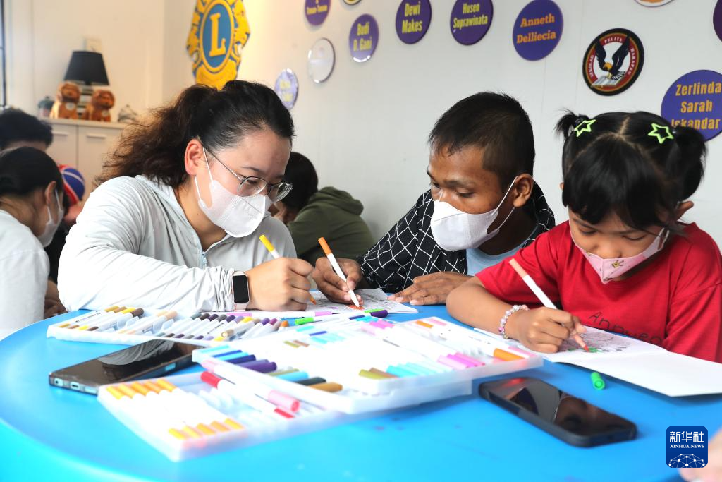 4月19日,在印度尼西亚雅加达,石凯欣(左)陪当地儿童癌症中心的小朋友画画。