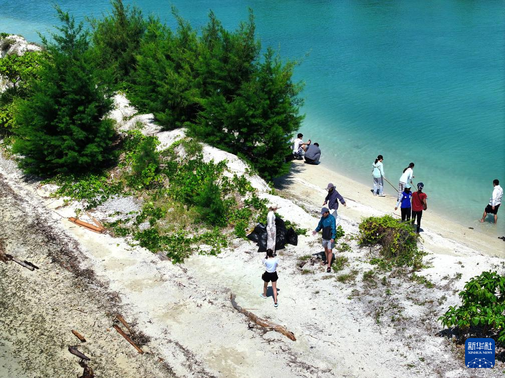 4月26日,志愿者在印度尼西亚雅加达的普拉穆卡岛海滩收集垃圾(无人机照片)。