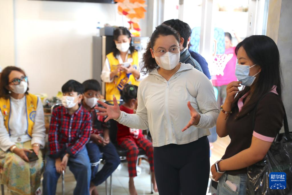 4月19日,在印度尼西亚雅加达,石凯欣(右二)在当地儿童癌症中心为志愿者讲解注意事项。