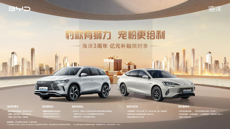 今年前10个月,比亚迪销量超325万辆,同比增长37%,累计销量已超越去年全年。时值海洋网成立三周年,为回馈“海粉”的信赖与热爱,海洋网推出“宠粉”大礼包,自2024年11月1日至11月30日,购买海豹07DM-i或海狮05DM-i,完成购车开票即可享至高5,000元保险补贴。贴心的钜惠好礼配合置换补贴,“最低0首付,至高5年超长贷”,“首付50%起,24期0息”,2年免费车机流量,2年免费云服务等多重好礼,让高品质的绿色出行体验更加触手可及。