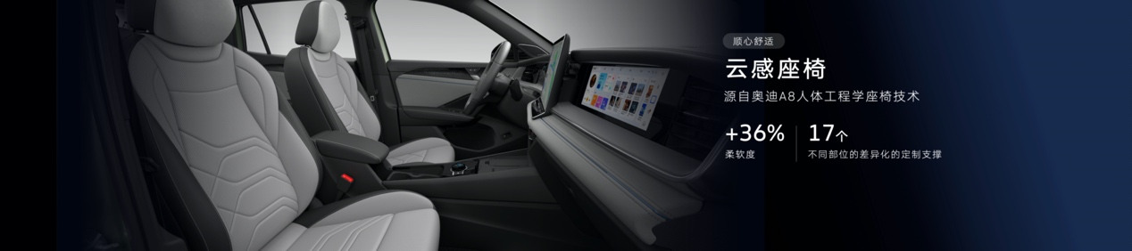 舒适体验上,全新探岳L配备了专为中国用户研发的云感座椅,座椅柔软度提升了36%,坐上去可以完全放松。除柔软外,云感座椅还拥有AudiA8同款人体工学座椅设计,提供身体从靠背到大腿共17处不同部位的差异化定制支撑,即使长途驾驶也不感疲惫,让更多用户体验到越级的舒适。
