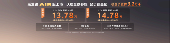 正月初八,广汽丰田以一场诚意满满的线上发布会,为广大消费者送上了一份特别开年礼——全新换代威兰达AIR版正式推出。这份“全球车新春大礼包”可谓干货十足:2.0L汽油AIR版权益价13.78万元,2.0L混动AIR版权益价14.78万元的亲民起价,搭配“入门配置拉满”的高规格产品力、全国统一价的“厂家直销保养套餐”以及长达8年超长期低息金融方案,积极回应了用户从购车、养车、用车全周期痛点的真实关切。