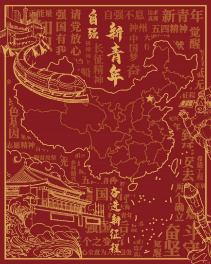 海报中主体为中国地图,刻画中国的美丽轮廓,海报内部辅助文字,是有关中国青年的一百个关键词,寓意着我们身为新时代新青年,要肩担历史重任。