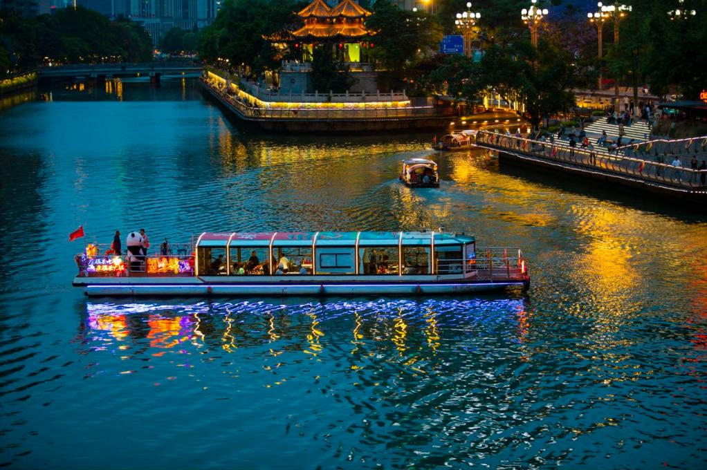 夜幕降临,一个“月亮”装置点亮四川成都锦江东门码头,人们在此排队等候登船体验“夜游锦江”项目。江面上,灵动的“大鱼”“神鸟”等飞行装置伴随游船行驶飞起;演员扮演嫦娥、玉兔、李白等为游客吟唱诗歌;火锅船、“江上KTV”、萌宠专线等不同主题游船往来如织。江岸上,沿线茶百戏、漆扇和桂花香囊制作、汉服体验、潮玩市集、街头艺人表演等丰富活动吸引市民游客驻足体验。