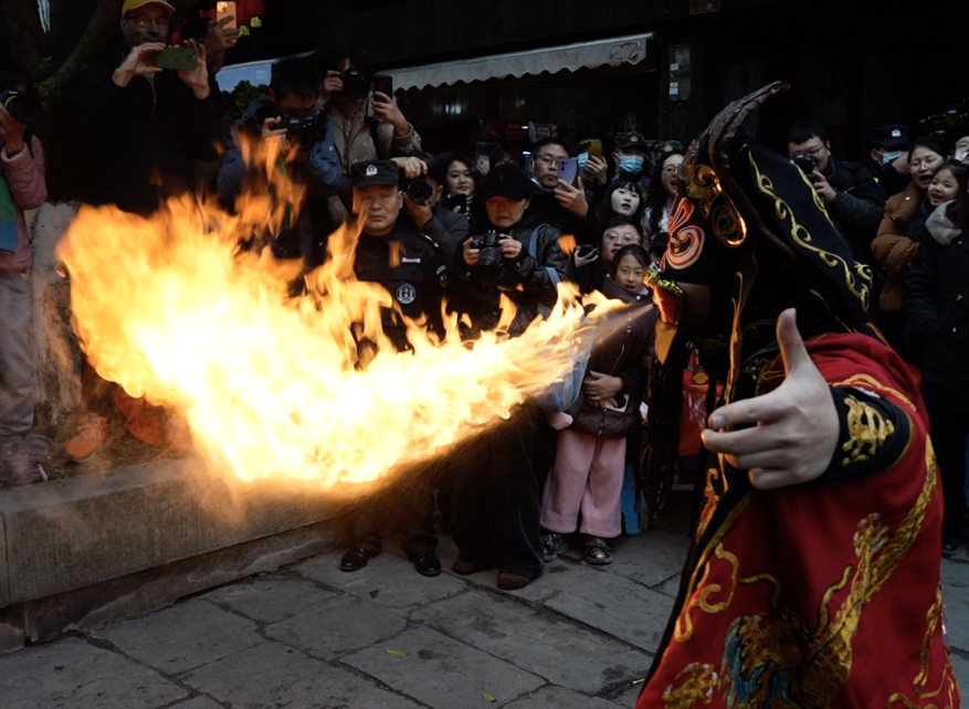 当天,非遗鲤鱼灯、舞龙舞狮、杂耍、川剧变脸吐火、状元巡街等10余项江津非遗项目接连上演,现场氛围热烈。新春楹联送福、非遗版画体验等活动,更是让八方游客流连忘返。